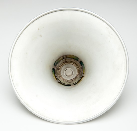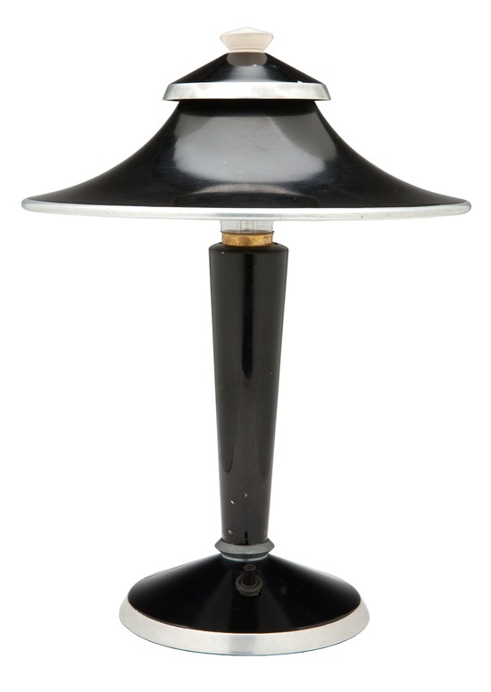 This rare 1930’s table lamp was designed by Walter Von Nessen (1899 - 1943). The black enamel double shade and shaft have chrome trim and sit on a black enamel domed base with chrome trim. Von Nessen’s signature glowing glass finial tops the lamp which is 9" in diameter.