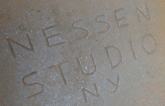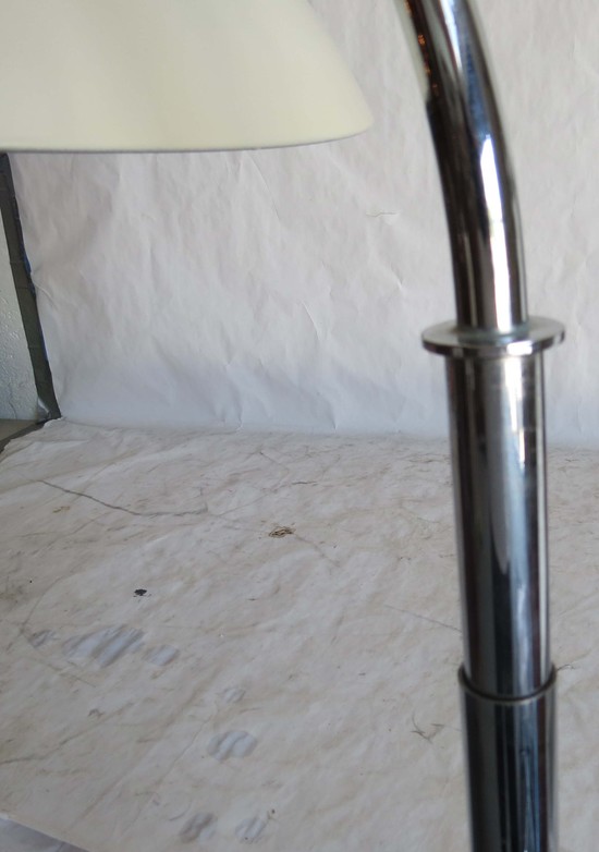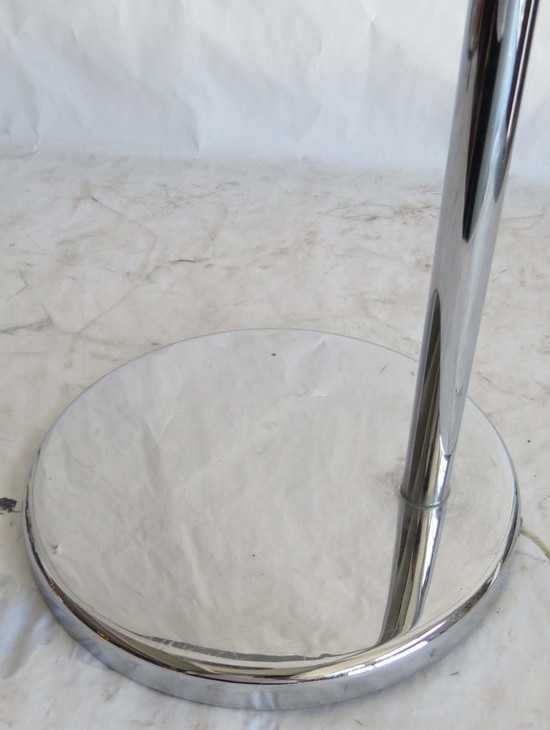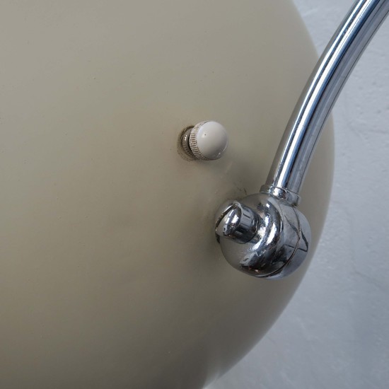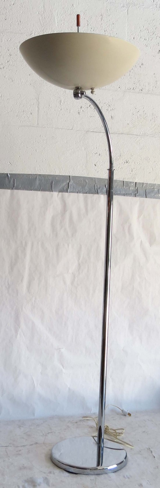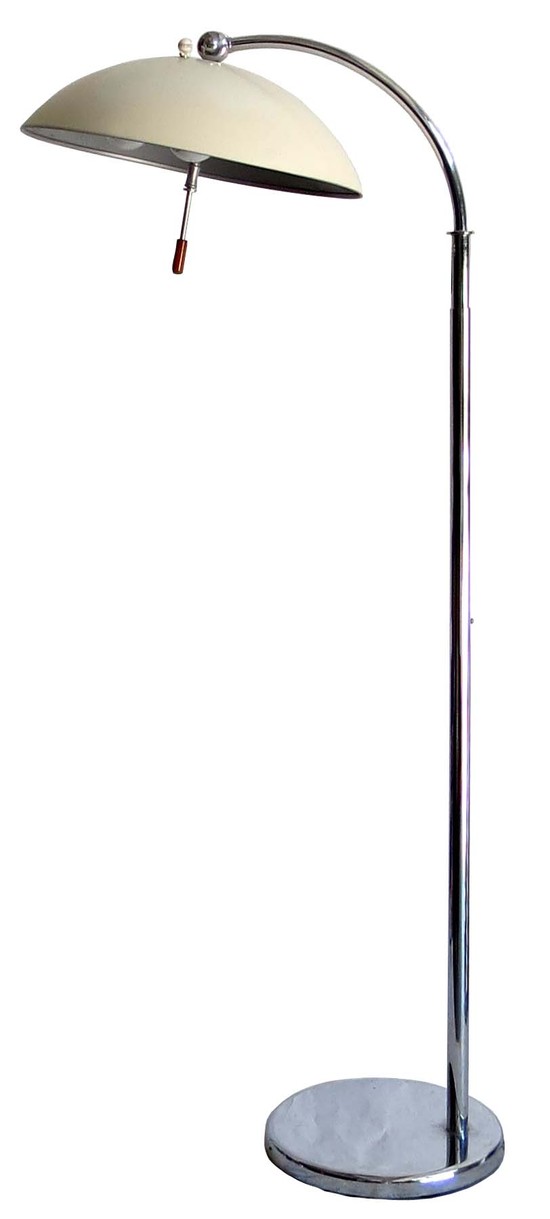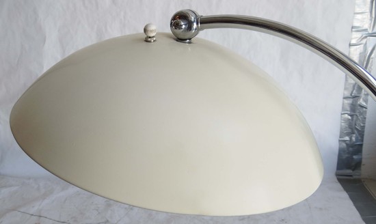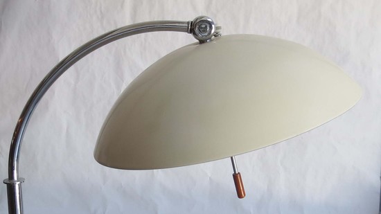 Walter Von Nessen (1889-1943) designed this rare American art deco floor lamp ca 1930 for Nessen Studio where he worked with a work force of one craftsman. The lamp has a round chrome base with an offset vertical chrome shaft, the shaft telescopes, raising the lamp from 50” high to 59” high (63” high with the shade swiveled up). The curved extension terminates in a fitting which enables the user to point the shade down for reading or up for ambient light. The enameled white dome shade has a switch on top to activate one, two or three of the bulbs. A rod with an orange Bakelite handle facilitates rotating the shade. The lamp is marked on the base “Nessen Studio, NY”.