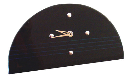 What a wonderful art deco streamline American electric clock. The clock is marked on the back "Waltham Watch Co., Waltham, Mass." The clock is a hemisphere shaped with a black mirror front and four electric blue parallel lines running across the front. The cardinal numbers are marked by silver buttons matching the silver hands. The clock measures 6" high by 11" wide.