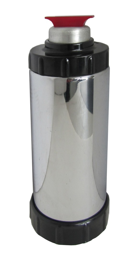 This rare American art deco cocktail shaker was designed by Ralph N. Kircher for the West Bend Aluminum Company, West Bend, Wisconsin in 1934. The chrome body has top and bottom rings of knurled black Bakelite and an aluminum cap with a red Bakelite finial. The base is marked "WB" in a circle. The shaker is in excellent original condition and has apparently never used. It is 12" tall.