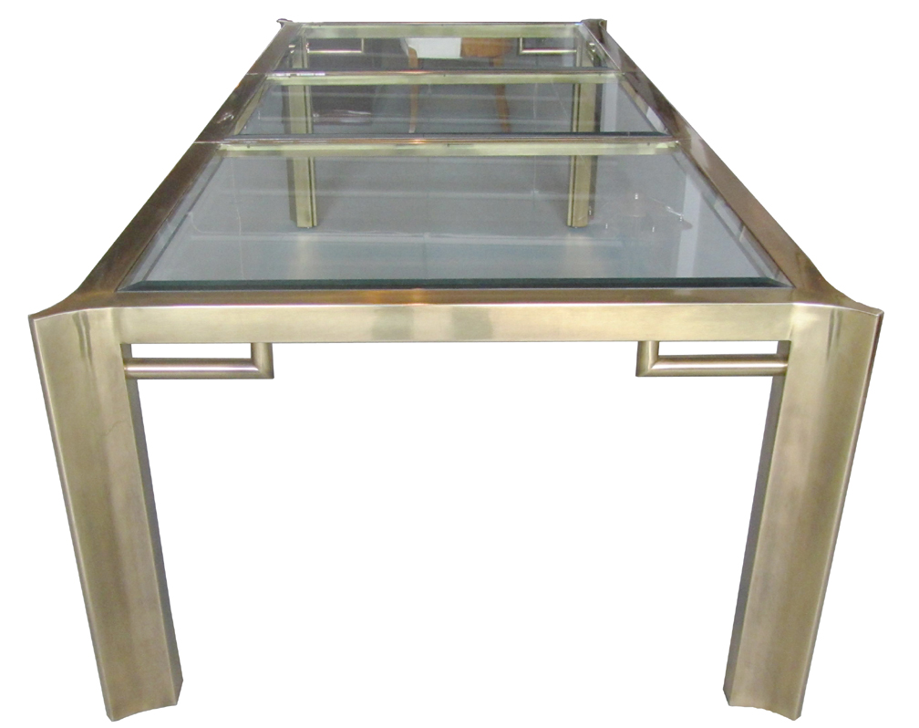 This 1960’s Mid-Century Modern Design brass and beveled glass table which could be used as a dining table, desk or as a conference table in a board room. Designed by William Doezema (1917 - 2009) for Mastercraft, Grand Rapids, the Company he founded in 1946 with his brother Charles and sold in 1974 to Baker Furniture. The table comes with a center leaf and soft pads for use with a table cloth. The table is 29" high, 43" wide and 74" long (104" with the leaf inserted) and is in excellent condition.