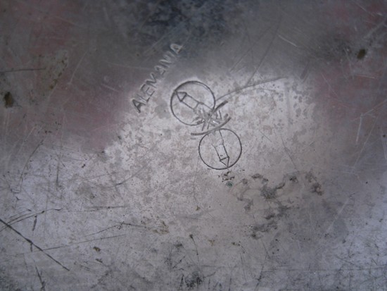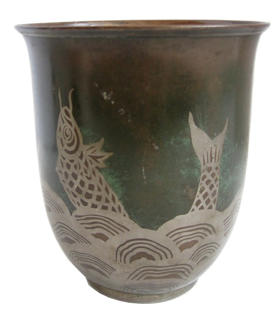This German art deco dinanderie vase was made by the Ikora workshop of WMF (Wurttembergishe metalwarenfabric) ca. 1929. The design was the one of the “Haustein School” of designers and craftsmen in Stuttgart headed by Professor Paul Haustein (1880 - 1944). The vase has a decor of leaping carp emerging from stylized waves. The technique is nickel inlay on copper with green and brick red fire patina. The vase is stamped “Alemania” , “WMF” and has the WMF cypher of a steeple in a circle (twice). It is 7 7/8” high, 7 in diameter (at the rim) and 3 ¾” diameter (at the foot). It is pictured on page 55 in “ WMF Ikora Metall” By Carlo Burchel & Heinz Scheiffele.