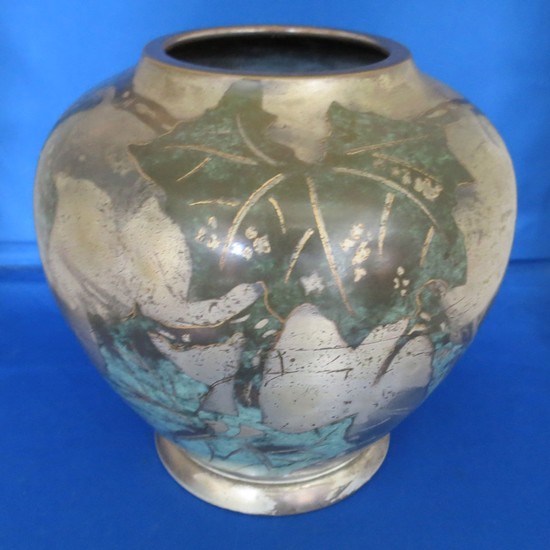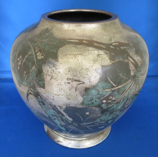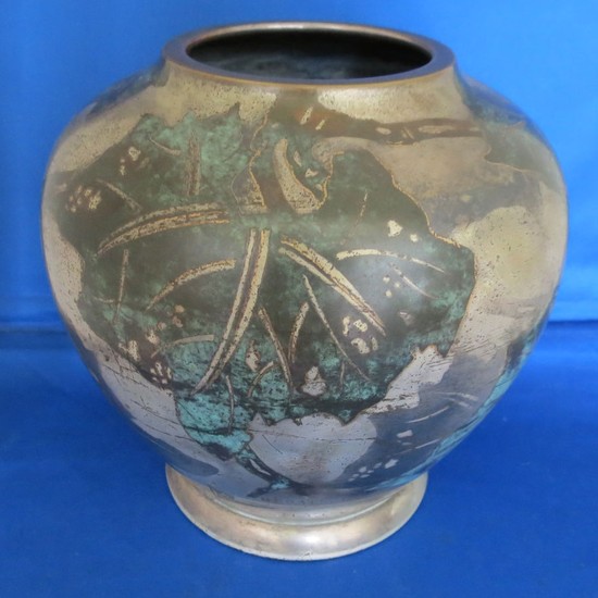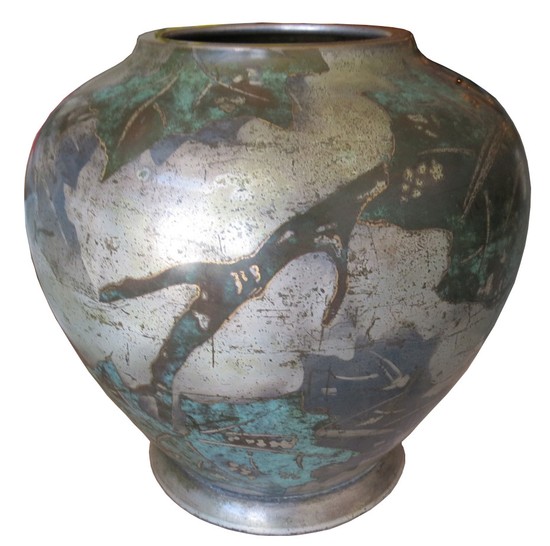 This German art deco dinanderie vase was made by the Ikora workshop of WMF (Wurttembergishe Metalwarenfabric) ca. 1929. The vase is bulbous in shape and has a decorative leaf pattern on all sides. The vase is brass. The background of the vase pattern is silver plate and the leaves are copper with verdigris accents. The vase was presented as a trophy for the Berlin 1929 Motor Yacht Club von Deutchland regatta. It is engraved near the bottom with the Motor Yacht Club of Germany flag/burgee, “M.Y.C. v D.’ (Motor Yacht Club von Deutschland) and “REGATTA 15.9.29”. The Motor Yacht Club of Germany was formed April 27, 1907. The club is located on the eastern shore of the Great Wannsee in Berlin, Germany. The vase has the WMF mark on the base. The stylized tower is derived from the emblem of Geislingen, a local landmark defensive tower. This mark was used from 1025-1950. WMF, Wurttembergische Metalwarenfabrik, was founded in 1880 after the merger of Straub & Sohn and Ritter & Co. of Esslingen, Germany. The vase is 5” tall by 7” wide at it’s widest point. The mouth is 3” in diameter. The base diameter is 4 ½”.