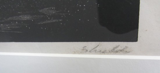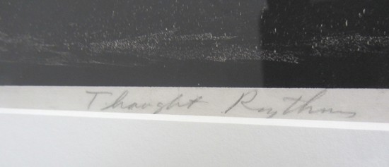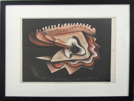 A color lithograph by Francis Bernard Shields (1908 - ) for the Federal Art Project of the (FAP) of the Works Progress Administration (WPA) in 1937. The print measures 11 ¾” high by 15 ¾ wide and is presented in a black wood frame with white mat. It is signed in pencil on the lower right “Shields”, titled in pencil on the lower center “Thought Rythms” also in pencil. On the lower left it is stamped “Federal Art Project, NYC, WPA”.
