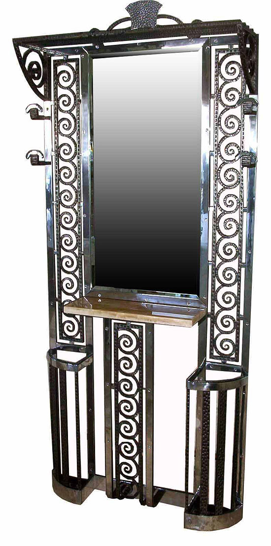 This French art deco hall tree dates from the 1930’s and is constructed of hand wrought iron and polished aluminum. The hall tree features a shelf for hats, hooks for coats, holders for umbrellas and canes, a marble shelf for keys and a beveled mirror. The tree measures 36” wide x 79” high and is 7 ½” deep.