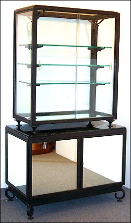 This French art deco wrought iron display cabinet in the style of Paul Kiss, dates from the 1930's. The top portion has glass on the top and on all four sides so items can be viewed from any of the sides. It sits on a variegated green marble slab. The bottom is mirrored on the sides and on the two doors. The doors open to reveal six drawers. The whole sits on four curled feet. The cabinet measures 64" high x 19 ½" deep and 35 ½" wide.