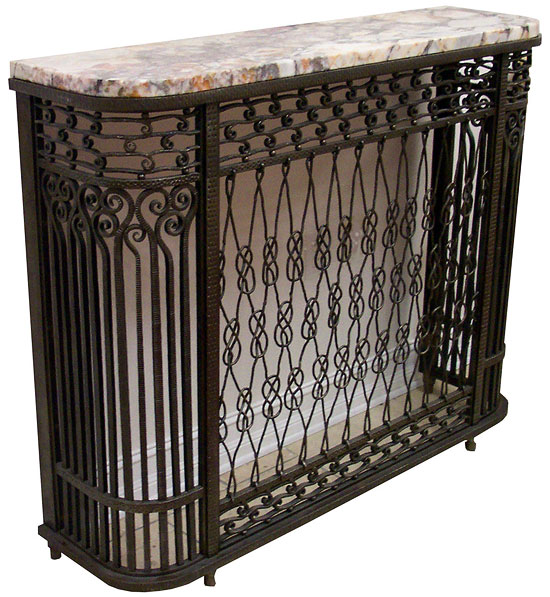 This French art deco wrought iron console displays a variety of hand working techniques, some traditional and some unique. The most unusual is in the central panel where the Ferronier has hammered the iron into a continuous rope tied into 34 knots truly an amazing display of technique. The top is fitted with a conforming 1" thick slab of pink, green, orange and white marble. The console is 48" wide x 40" high x 13" deep.