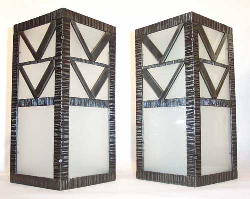 A very unusual pair of French art deco hand wrought iron corner sconces from the 1930s. The fixtures are finished on the two front sides and attach to the walls of a corner on the other two sides. The two front sides as well as the bottom are fitted with frosted glass. The wrought iron has been cleaned and the fixtures have been rewired for American electricity. The sconces measure 10" high by 6" on each side. A great accent piece for any corner!