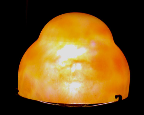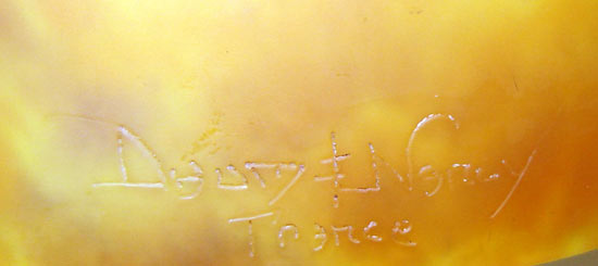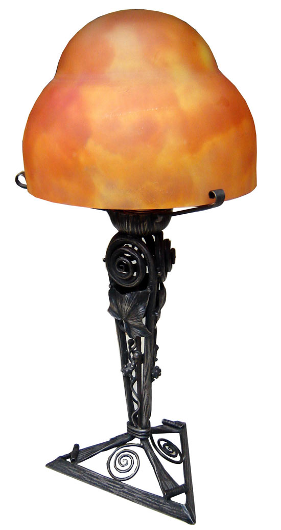 This French art deco table lamp dates from the 1920’s. The triangular wrought iron base supports a central shaft decorated with vines and leaves. The swirls on the base are repeated at the top. The double dome glass shade is signed “Daum Nancy France” with the Cross of Lorraine. The shade is orange and yellow in reflected light and a wonderful sunset/sunrise color of pink and palest of green in transmitted light (when the light is turned on). The lamp stands 20” high.