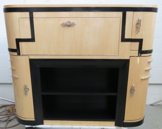 A most striking 1930’s American art deco freestanding bar. The blond maple veneered body is contrasted with black lacquer and nickel handles, speed lines and hinges. The central panel pulls down to reveal an illuminated working bar with mirrored back and working surface with etched cocktail images. Two shelves in black lacquer are for glassware storage, the doors on either side open for bottle storage and the space behind the top right hand door is for bar implements. Overall the bar is 52” wide, 14” deep and 43” high.