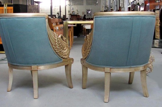 A Pair of American Art Deco Silver Leaf Chairs with Figural Swan Arms
