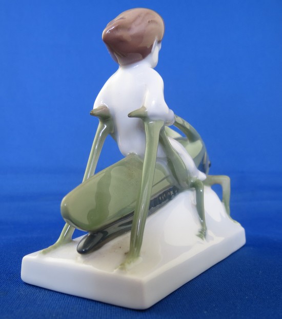 Rosenthal porcelain of boy riding a grasshopper by Albert Caasmann (1886-1968) ca. 1920. The figure is called “sommerritt” in German, summer ride in tagloit. The 3 ½” high, 4” long figure is marked on the bottom “ Rosenthal Selb-Bavaria” in green underglaze. The figure is in mint condition.