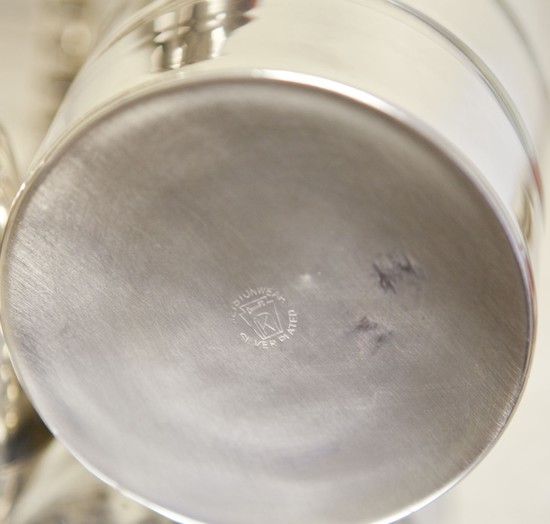 Alfons Bach (1904 – 1999) designed this American art deco silver plate cocktail set for the Keystone Silver Company in the 1930’s. The silverplate tray with its rolled ends surrounding black Bakelite handles is unique in the era’s design vocabulary. The four cups and shaker have “speed” lines incised into the body and the stems. All six pieces are in excellent condition. The tray measures 18” x 10”, the four cups are 4 ¾” high and 2 ½” in diameter. The cocktail shaker is 10 ½” high and 3 ½” in diameter.