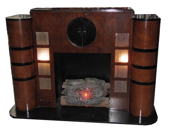 This 1930’s American art deco electric fire place is hot! And cool! The “fire” isn’t real but the look is! Constructed of burl walnut and straight veneers and black lacquered wood, the fireplace has illuminated “glass” blocks, a “port hole” that opens, black lacquer “speed” lines around the two flanking columns and an electric “fire” that looks like real logs burning. The fireplace is 41” high x 58” wide and 21” deep. It is in good original condition and has been rewired.