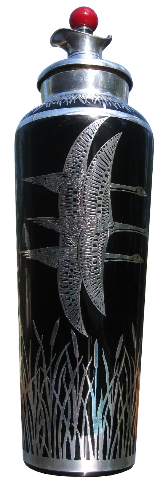 This is one awesome American Art Deco cocktail shaker. The tall (15 ½”) shaker is made of black glass with a Sterling silver overlay scene of three very art deco geese flying in formation over cattails. The silver overlay is by the Rockwell Silver Company of Meriden, CT. A silver neck and pouring cap and red Bakelite finial sit atop the shaker. The Rockwell shield is acid stamped on the bottom. The shaker is in excellent (probably unused) condition.