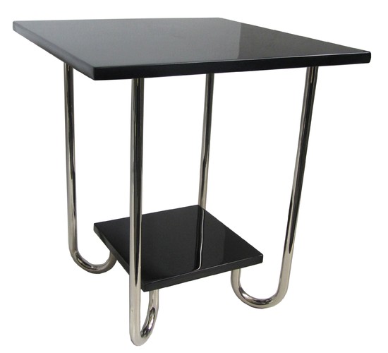This American art deco machine age table is from 1930’s. The 21 ¾” high table has a 19 ½” square black lacquer top and a 10 ½” square black laquer bottom shelf, both have been refinished. They are connected and supported by four “Harpin” chrome legs which have been replated