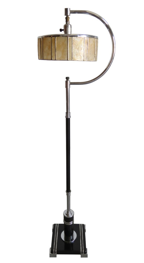A few months ago we sold two floor lamps noting that there were no markings on them. We now have another reading lamp and it is marked...twice. The base is marked “J.L. Stuart Mfg. Co. SF” (San Francisco). The shade is marked “Sandel Manufacturing, Chicago, IL” The lamp has a “C” of chrome supporting a 10” diameter shade with a stepped chrome top. The base is a square wood base inlaid with chrome “speed” lines and sits on chrome corner feet. The bottom of the pole is a column of black enameled metal with two “speed” bands topped with a chrome section. The shade swivels to direct light for reading. The lamp is 50” tall, has been rewired and is in great vintage condition.