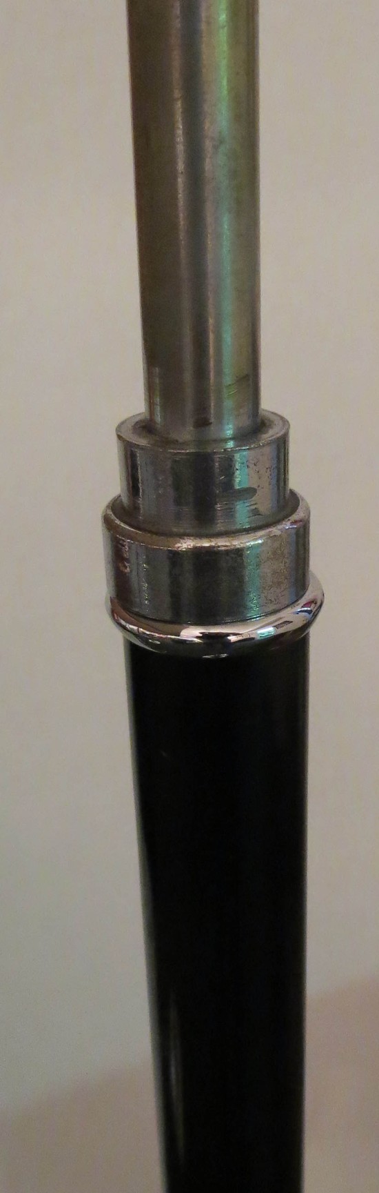 No, it’s not by Donald Deskey! This American art deco floor lamp is from the 1930’s and shares the top superstructure with Deskey’s famous floor lamp. This lamp starts off with a domed chrome base with two chrome bars on a raised black disc. An ebonized ball is held in place with two chrome mounts. A black enameled shaft supports the aforementioned superstructure from which is suspended the original textured shade. The lamp has been rewired and is in excellent original condition and is 58 1/2" tall.