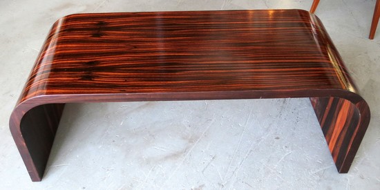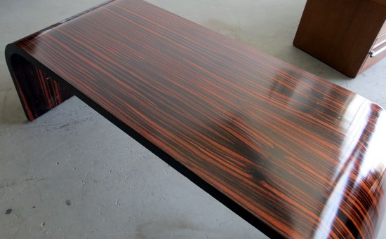 This stunning American art deco coffee table in the form of an inverted "U" is clad in old growth macassar ebony veneers. The table has been lovingly refinished and is in excellent condition. The table is 47" long x 20" wide and 17" high.