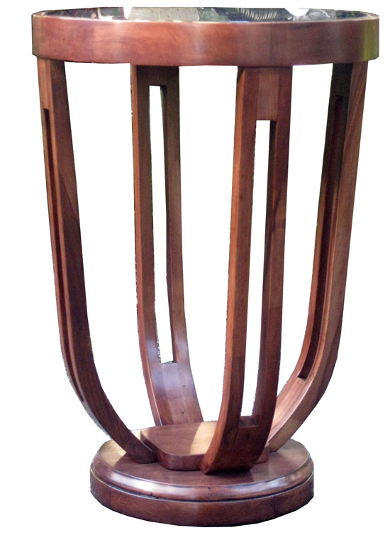 This 1930’s American art deco occasional table is constructed of solid walnut and has an inset black mirror top. The table rises from a 13” round base on four supports which curve inward at the bottom. The supports each have two parts separated at the top and bottom by wood sections. The 19” round top has a 2 ¼” apron and the inset black mirror. The table is 27 ½” high.