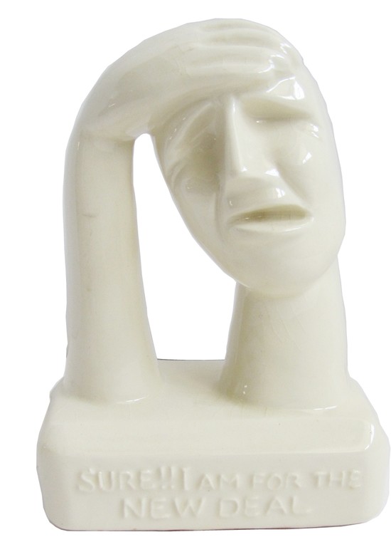 This American art deco satirical anti-New Deal ceramic bust is from ca. 1936. The cream colored ceramic bust of an unhappy and perplexed man with his hand to his head speaks of a time when Roosevelt’s "New Deal" legislation to pull the country out of the depression caused a storm of opposition from those who did not agree with the policies of the New Deal. The bust has the caption in raised letters on the base "SURE!! I AM FOR THE NEW DEAL". The bust is 8" tall, 6" deep and 3 ½" deep.