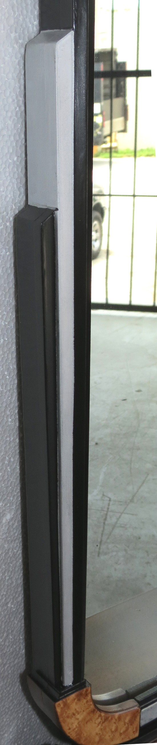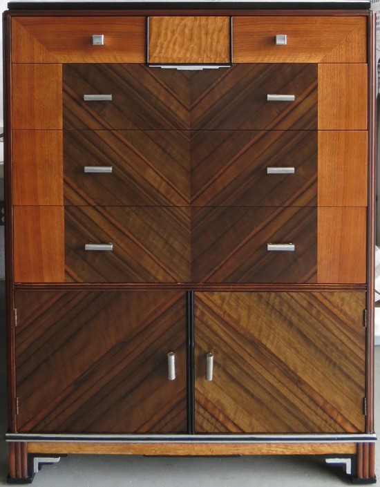 This stunningly beautiful skyscraper design American art deco bedroom set was made by Northern Chicago Furniture Company in the late 1920's. Constructed of exotic veneers of macassar ebony, walnut and birdseye maple with silver leaf and ebonized wood accents with chrome pulls and handles. It consists of a full size bed, vanity and stool, low chest with mirror and a tall chest. The two mirrors are beveled. The set has been restored and is in excellent condition. The low chest is 48” wide, 21” deep and 34” high (excluding the mirror which is 31 ½” high), the tall chest is 35 wide, 21” deep and 50” high, The vanity is 64” high including the mirror, 45 ¼” wide and 17” deep and the vanity stool is 26” wide, 13” deep and 19 ½” high. The headboard is 57” wide and 42” high.