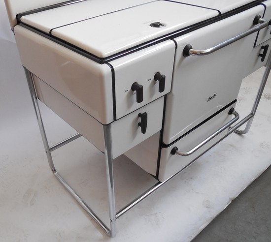 An American art deco stove, oven, and griddle. This Magic Chef stove is by the American Stove Company Saint Louis, Missouri and was made in 1936 and is in excellent condition. It is in white porcelain over cast iron with chrome steel supports and handles for the oven and under storage. The porcelain is in excellent condition, the support chrome is bright and shiney it even has the “Magic Chef” logo and the original on-off and warning decals are intact. The light above the stove works as well as the timer. The stove is 46” wide, 30” deep, and 60” high. A similar stove is in the collection of the Wolfsonian Museum, Miami Beach, Florida.