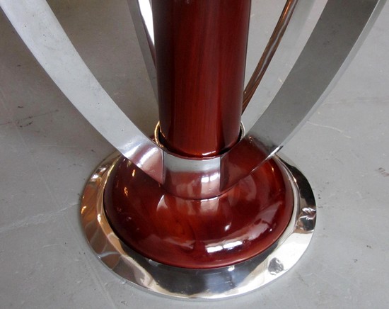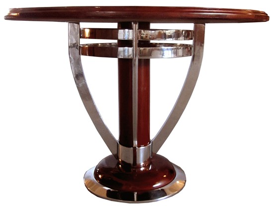 This machine age American art deco center table was made in the 1930’s. The streamline design table will grace any foyer or entry. An aluminum ring encircles the domed base while four curved supports rise from an aluminum collar to support the top. The supports are joined by two flat bands of aluminum. The base, shaft and top are Cuban mahogany. The table is 31” high and 42” in diameter.