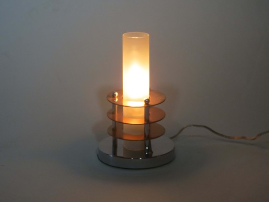 This sweet little American art deco table lamp is from the 1930’s and bears a resemblance to Flash Gordon’s “ray gun”. The chrome base has three chrome rods held on with chrome balls. Three copper rings encircle the frosted glass tube which illuminates when the switch on the base is turned on. The lamp is 7 ½” high and 4 3/4” in diameter at the base. It is in excellent condition and has been rewired.