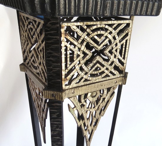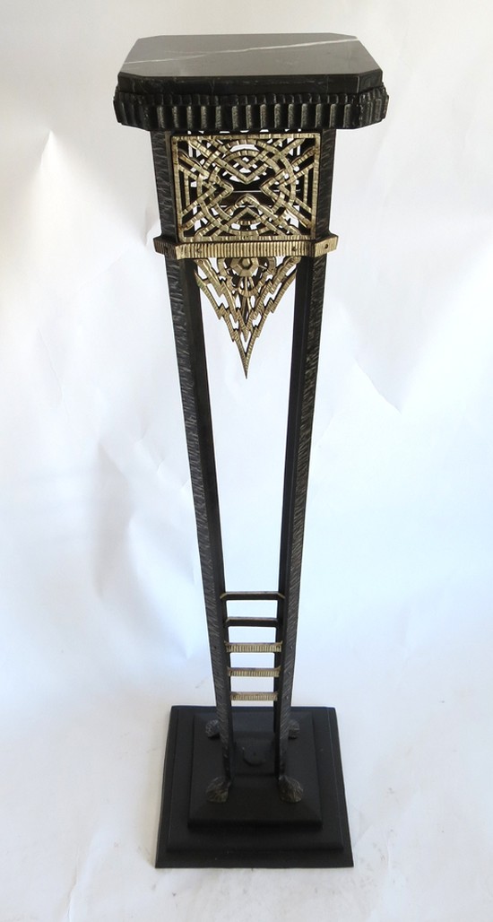 This 1920’s American Art Deco pedestal is constructed of hand wrought iron and has a marble top. From a stepped base four arms rise, connected by three square silver polished iron rings. The apron is of silver polished iron in a variety of 1920’s Jazz Age motifs. The top is a square of polished black marble with white streaks. The symmetry of the form is balanced by the contrast of black and silver to create and object which will enhance any home. The pedestal is 42” high and sits on a 10 ½” square stepped base. The marble top is 9 ½” on each side.