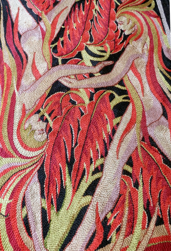 This exciting original art deco hand woven tapestry is from the 1920’s and was created in Eastern Europe for the French market. The crewel work weaving shows two nude maidens on a black background. Their hair swirls and flows in red and blond as they dance about a fern with green stem and red leaves. The colors are bright and true and the tapestry is in great condition. It is 76” high x 38” wide.