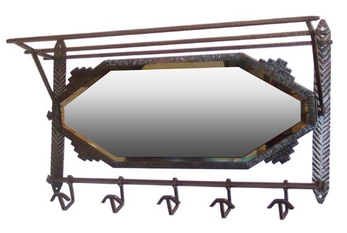 This 1930s French art deco mirror with with a hand wrought iron coat rack & hat rack. Finely crafted, this piece will look great in any decor. It measures 36" wide by 21" high and extends 10" from the wall. It functions wonderfully as an entry piece or in a bathroom, providing a mirror and towel rack.