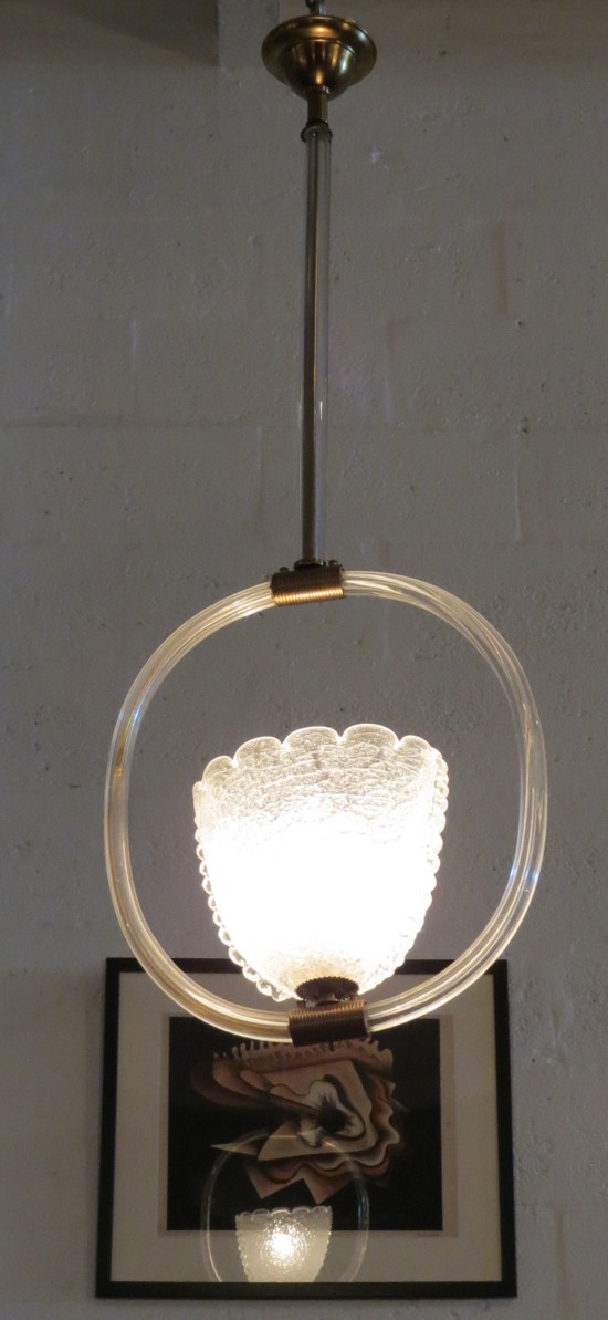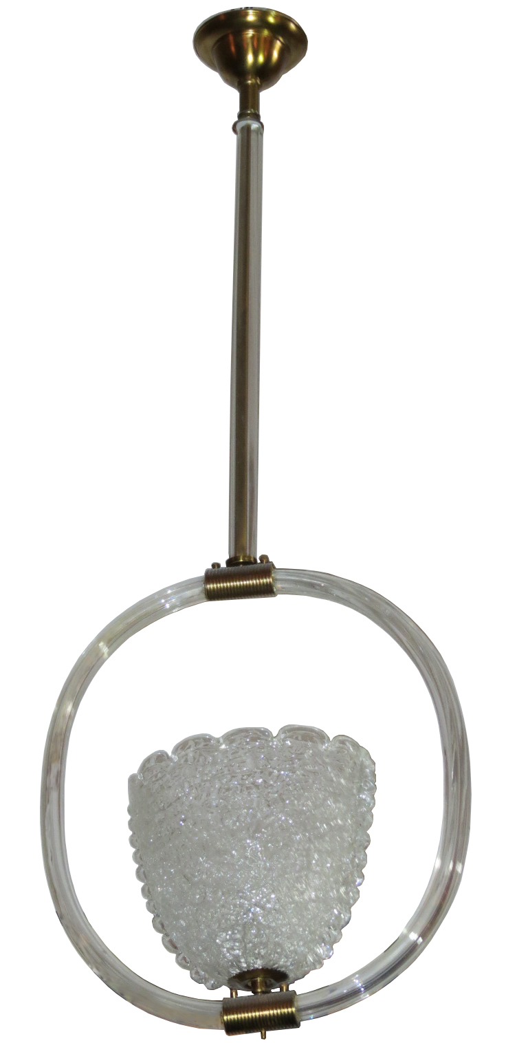 Made in the 1930’s, this Barovier & Tosso ceiling light is constructed of bronze and blown glass. A ribbed glass rod hangs from the bronze ceiling cap and holds a circle of ribbed glass. Centered in the glass circle is a bowl of Murano glass with reticulated top and applied glass fringe. This quality fixture, which drops 37” from the ceiling and is 16” in diameter, has been rewired for American electricity and is ready for your home.