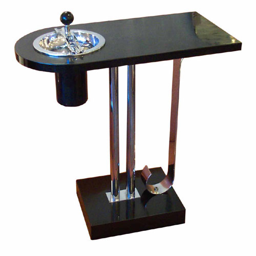 This American art deco occasional table is in black lacquer, nickel steel and composition top is the companion piece to AF23. Designed by Charles Hardy for Belmet Products of New York ca. 1936, has an ingenious removable ash receiver built in. A pull of the knob and the ashes fall into the container (which is easily removed for disposal). The table measures 20” deep x 10” wide and is 21” high.