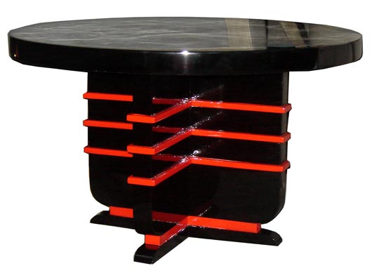 This American art deco streamline occasional table dates from the 1930’s. Refinished in high gloss black lacquer with raised “speed” lines in Coca-Cola red lacquer. The table base has four “wings” which support the circular top. The table measures 30” in diameter and is 18 ½” high.