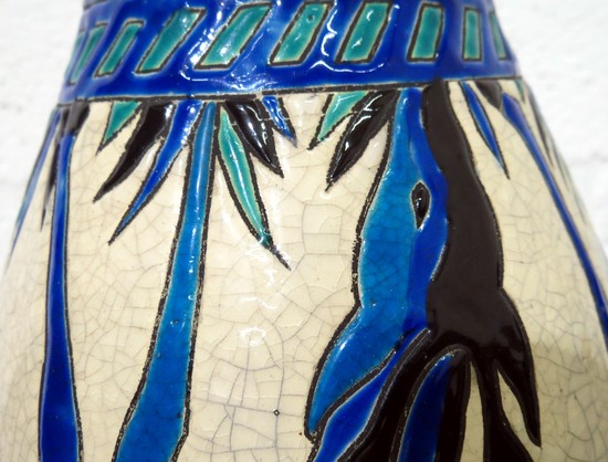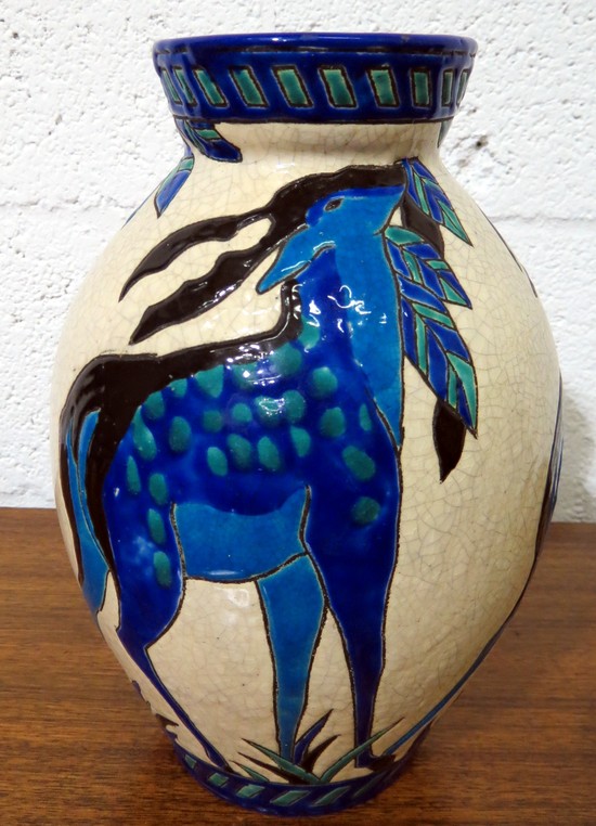 This striking Belgian Art Deco vase is one of a series of shapes and forms on the theme "Biches Bleues" that Charles Catteau (1880 -1969) created in 1925 for Boch Freres in La Louviere, Belgium. The line was first exhibited at the 1925 Exposition Internationel Arts Decoratifs et Industriels Modernes in Paris. Enameled in shades of dark and light blue with green on a craqueleured white ground, the vase portrays deer in various positions. Arguably Catteau's most famous design, the deer became an icon of the Art Deco Era, known in the company literature as Design # 943, the design was used from 1925 into the 1940's. Biches Bleues is pictured in the book "Catteau" on pages 25, 38, 55 and 234; on page 62 of the book "L'Homme de Keramis, Charles Catteau; on pages 18, 33, and 48 of the book "Ch Catteau, La Louviere Formes & Techniques". In the book "Art Deco Ceramics Made in Belgium Charles Catteau", Biches Bleues apperas on pages 114 and 274. The vase is 9 1/2" high and is impressed on the base "1264". It is also marked "29X" and is in excellent condition.