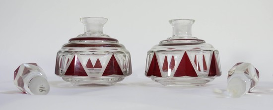 A striking czech leaded glass dresser set from the 1930’s. The set has a powder jar, two perfume or cologne bottles and a spray atomizer. The set is clear glass with red enamel, the enamel is highlight by a series of wheel cut lines, the body and finials are faceted. the tallest is 5 ¼” high.
