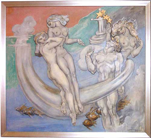 An American oil on canvas painting by Donald DeLue (1897 – 1988) titled “Mermaids of the Sea”, dated “1939” and signed on the lower right. DeLue was an important figural sculptor who worked in the WPA and received many awards and commissions in his lifetime. The painting, which is in his heroic style, features three nude damsels and one man. Stars and fish in gold stand out against a pastel background. The painting measures 36” x 40” and is presented in a black and silver frame. The painting is stylistically related to a drawing reproduced on page 34 of D. Roger Howlett’s book The Sculpture of Donald DeLue, Gods, Prophets and Heroes.