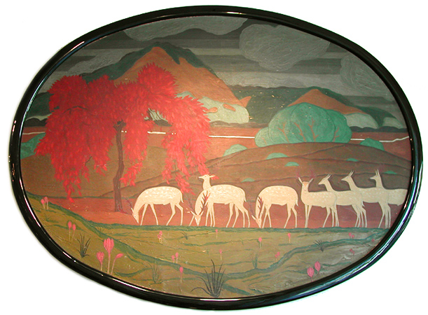 This large art deco oval oil on board painting is by Louis-Georges Dumouchel, who was born in Havre, France in the late 19th Century. By 1919 he was exhibiting at the Salon des Independents and at the Salon D'Automne. He specialized in portraits, landscapes and animal figures. The painting is signed "L. Dumouchel 1920" and measures 46" x 62 1/2" and is presented in its original oval frame, freshly black lacquered.