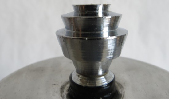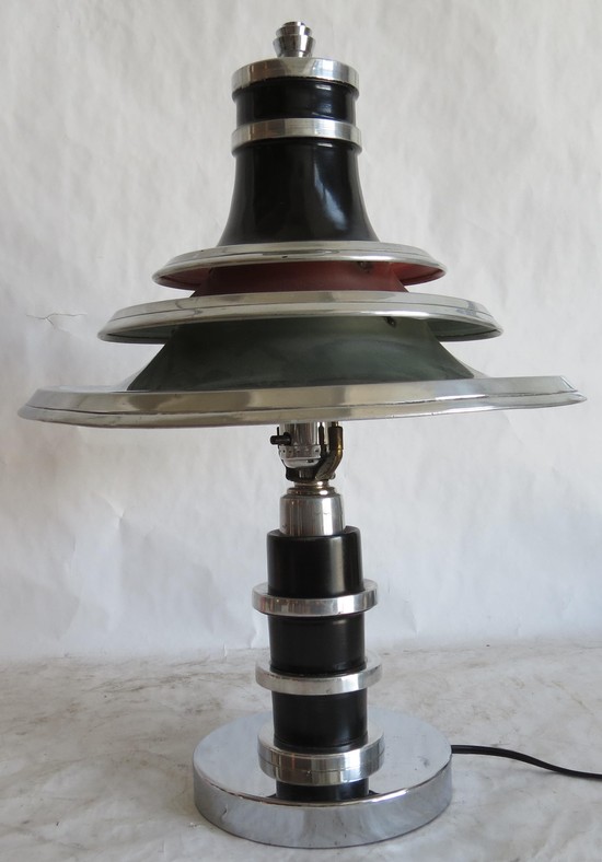 This American art deco table lamp is from the 1930’s. It was designed by Edward Kent for the Railley Company, Cleveland Ohio. Constructed of black enameled and highly polished aluminum, the lamp is a testimony to the machine age. The downward slope of the three graduated shades is repeated in reverse with the finial. The black enameled shaft is split by three polished aluminum rings. The interior of the bottom shade is painted white to reflect light for reading or work. The diffused light from the next two shades is colored by red and green painted interiors. The lamp is 18” High, has been rewired and is in excellent condition.