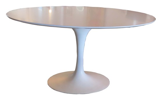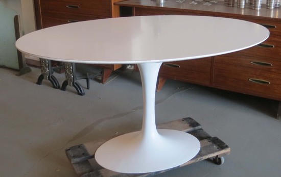 This table was designed in 1956 by Eero Saarinen (1910-1961) for Knoll Furniture Company. It was part of the "tulip" or pedestal group which knoll advertised as "The Saarinen Collection". He said the collection "As to the pedestal furniture, the undercarriage of chairs and tables in a typical interior makes an ugly, confusing, unrestful world. I wanted to clear up the slum of legs." The Table has a base of molded, cast aluminum finished white. The table is 28 1/2" high, 36" wide, and 54" long.