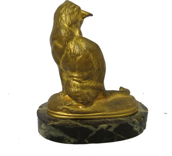 This gilt bronze figure of a seated cat is by famous French sculptor Emmannuel Fremiet (1824 – 1910). It is incised on the base “E. Fremiet” and”P. Barbadienne”, Paris”. The sculpture sits on an oval ½” high piece of marble (much abused) and is 3 1/8” high.