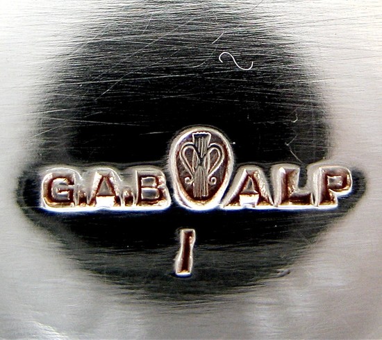 Folke Arstrom (1907 – 1997) designed this very “Avant-Garde” cocktail shaker in 1935 for GAB (Guldsmeds Aktie Bolaget) in Sweden. The shaker is in silver plate with a grooved black Bakelite top. It has the original strainer and cork seal. The bottom is marked with the GAB logo and “NS” and “ALP”. This important shaker is pictured in What Modern Was on page 84 and The Cocktail Shaker on page 75. It measures 8 ½” high and is 3 ½” in diameter.