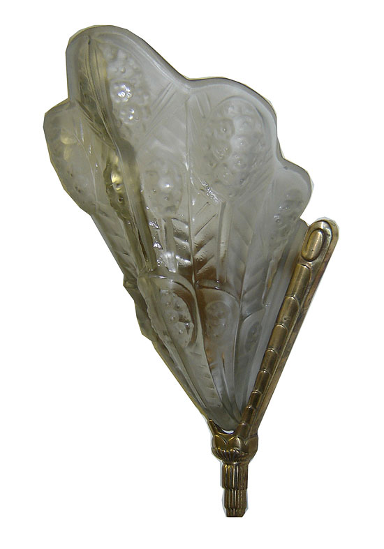 This set of four French art deco bronze & glass sconces date from the late 1920s. The bronze “V” shaped holder drops to a 3 stepped bottom. The glass is of a stylized floral design. The sconces measure 12” high by 6-1/2” wide and project 7” from the wall.