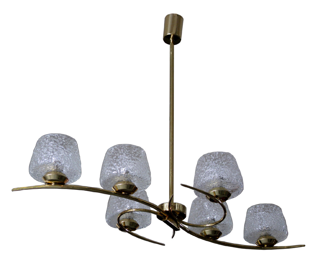 This 1950’s French chandelier hangs 19 ½” from the ceiling on a brass rod. The six glass shades sit on an elegant “X” support. The fixture is 38” long and 14”wide.