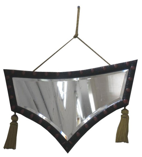 This French art deco mirror frame is finished in black enamel with carnelian red raised dots. Glazed with a curved beveled glass, the mirror is hung with golden silk cord terminating in to knotted tassels. The mirror measures 29” wide and 20” high (32" from the top of the suspension cord).