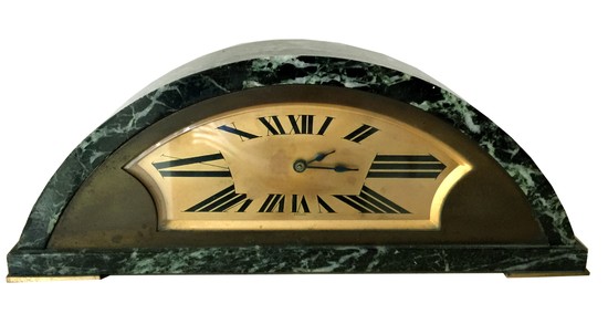 This extremely elegant French Art Deco marble and bronze clock has a gold tone roman numeral face surrounded by bronze plates and encased in green marble. The inside is marked "C.H. Hour France" and the numbers on the works and the case correspond. The clock is 4 3/4" high x 12 1/2" long and 3 1/4" deep. $ 2100