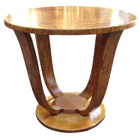 This French art deco occasional table is from the 1930’s. The curly maple veneers have been quarter sawn and exhibit wonderful depth and fire. The form is pleasing, with four reverse curved supports rising from a solid maple base, topped by a 27 ½” diameter top. The table is 24” high and is in excellent condtion.