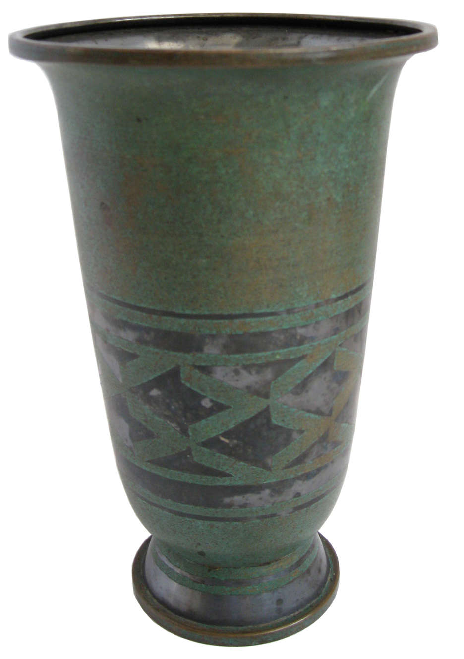 This French art deco vase was designed ca. 1929 by Luc Lanel (1893 – 1965) for Orfeverie Christofle, Paris. The copper vase, with green and black oxidized patina has a band of "arrowhead" decor a flaring rim and a spread foot. It is marked on the base "Chirtofle", "B 187" and "E". The vase is pictured on page 52 of "Lanel, Luc & Marjolaine" by Dominique Forest. The vase is 8 ½" high 5 ¾" diameter (at the rim) and 3 3/8" diameter at the foot.