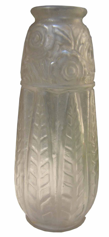 This French art deco frosted glass vase is from the 1930’s. The raised decoration is of geometric flower heads across the upper portion and geometric ferns around the base. The vase is marked on the bottom “France” and is 11” high.